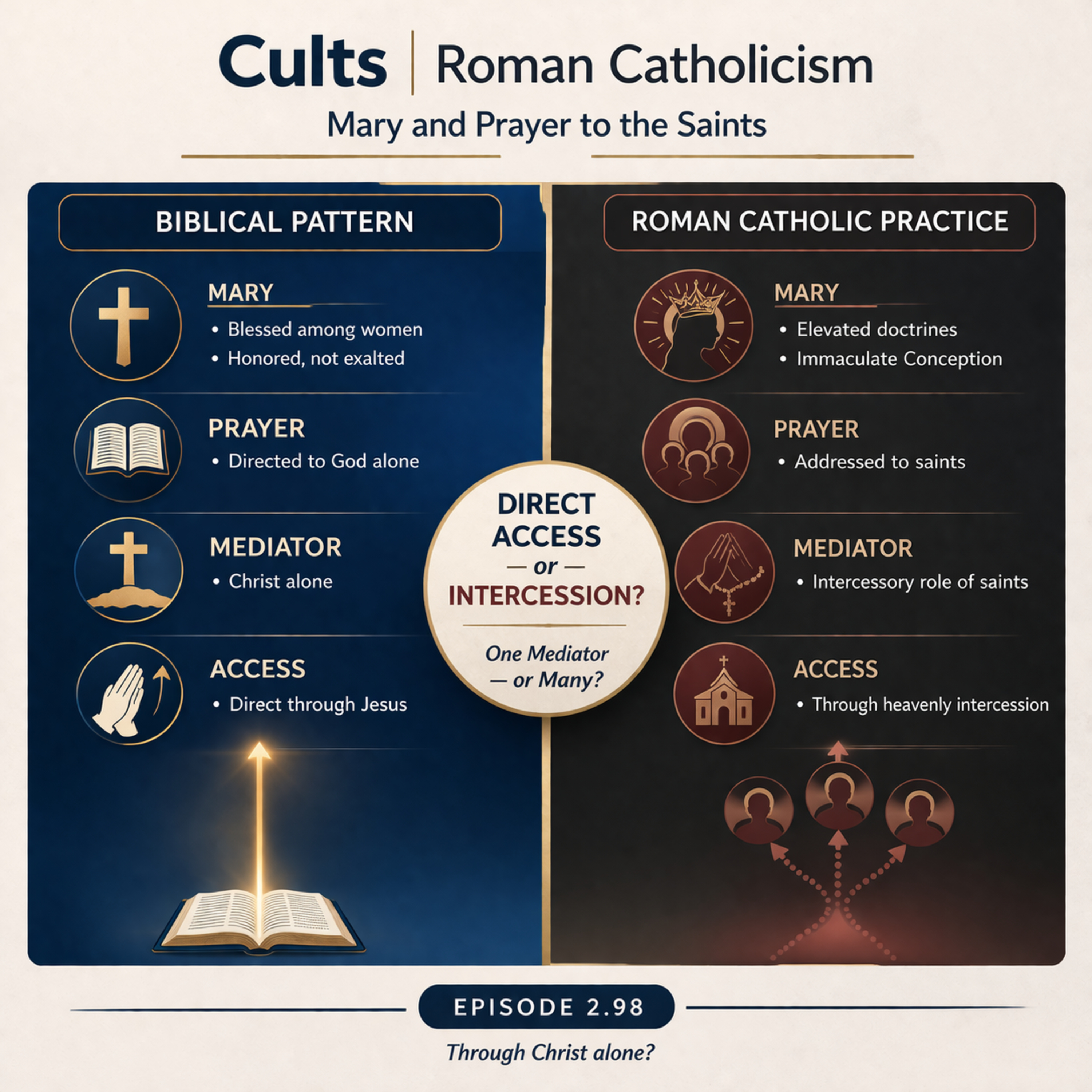 Episode 2.98 In this episode of Cults, Michael and Zach examine two closely related areas of Roman Catholic theology: Marian doctrine and prayer to the saints. The goal is not to question whether Mary was blessed—Scripture cl...